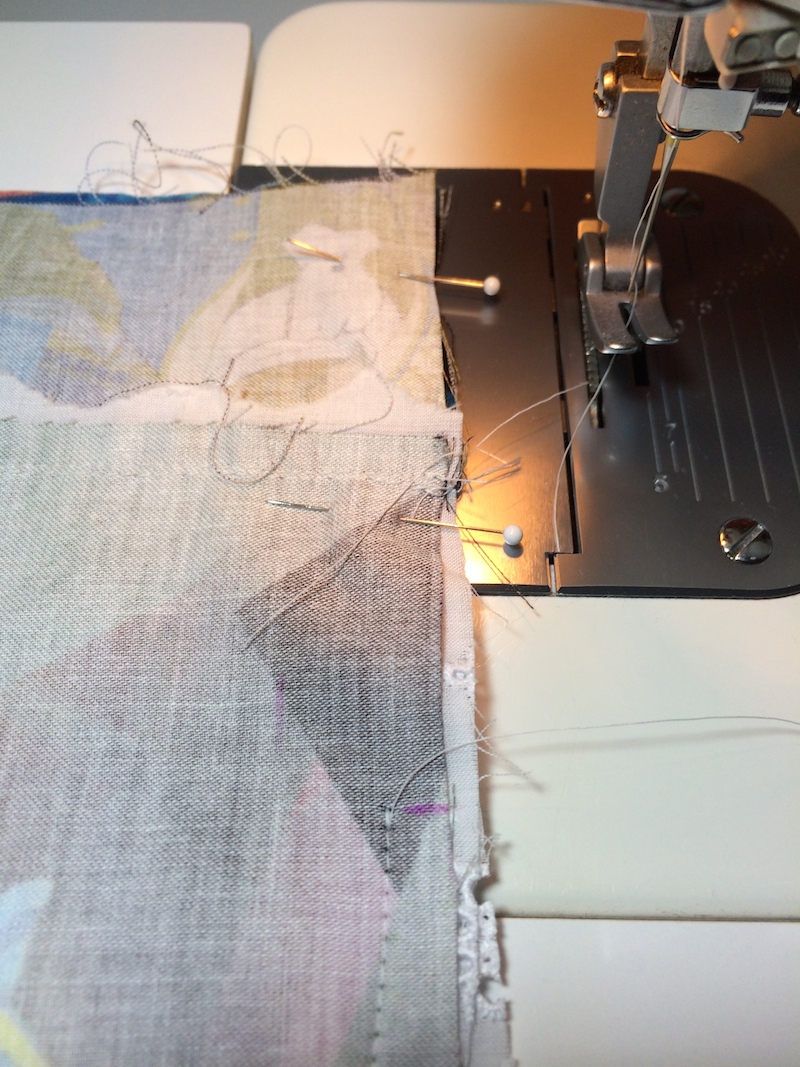 2を中表で二つに折り、端(輪でない方)から10cmを縫い残し、両脇を縫う。裏布も同様に端から10cm縫い残し、両脇を縫う。