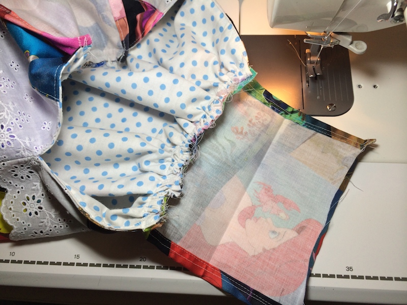 口布の両脇を1cmの三つ折りにして端を縫い、ヨコ方向を1cmで折ってアイロンで線をつけておく。バッグ布の口側に粗ミシンをかけて15cmくらいに縮める。