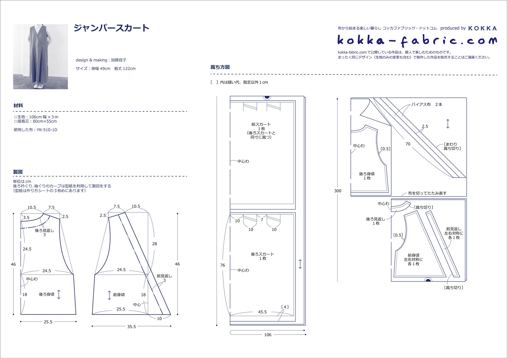 今回はロング丈のジャンパースカートですが、短めにしたいときや、さらにロング丈にしたいときは、スカート丈の寸法を加減して調整してください。