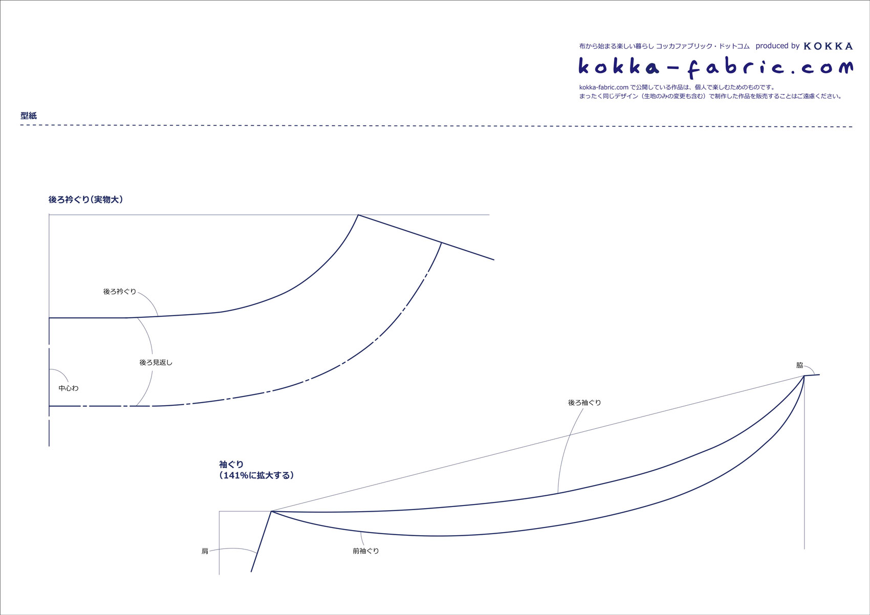 身頃は、まず製図用紙に前後の袖ぐりと後ろの衿ぐり以外の直線部分の線を製図の寸法を見ながら書きます。そこにこのサイトからダウンロードしたPDFレシピの3枚目にある袖ぐり、衿ぐりの製図を重ね合わせてカーブ線を引いてください。