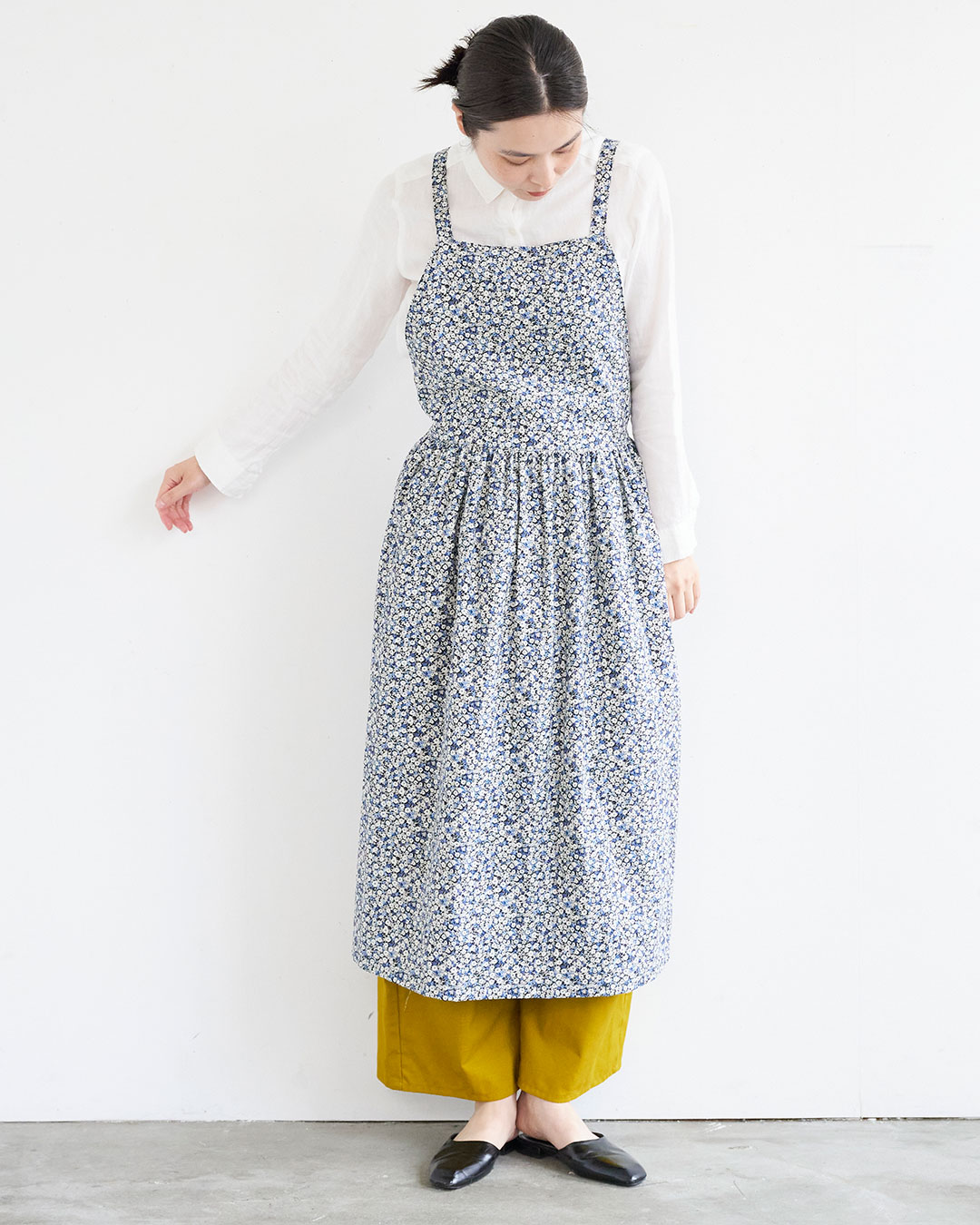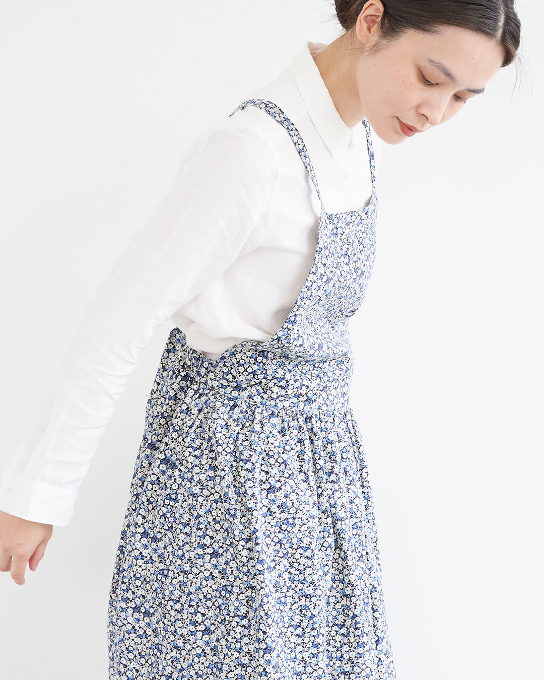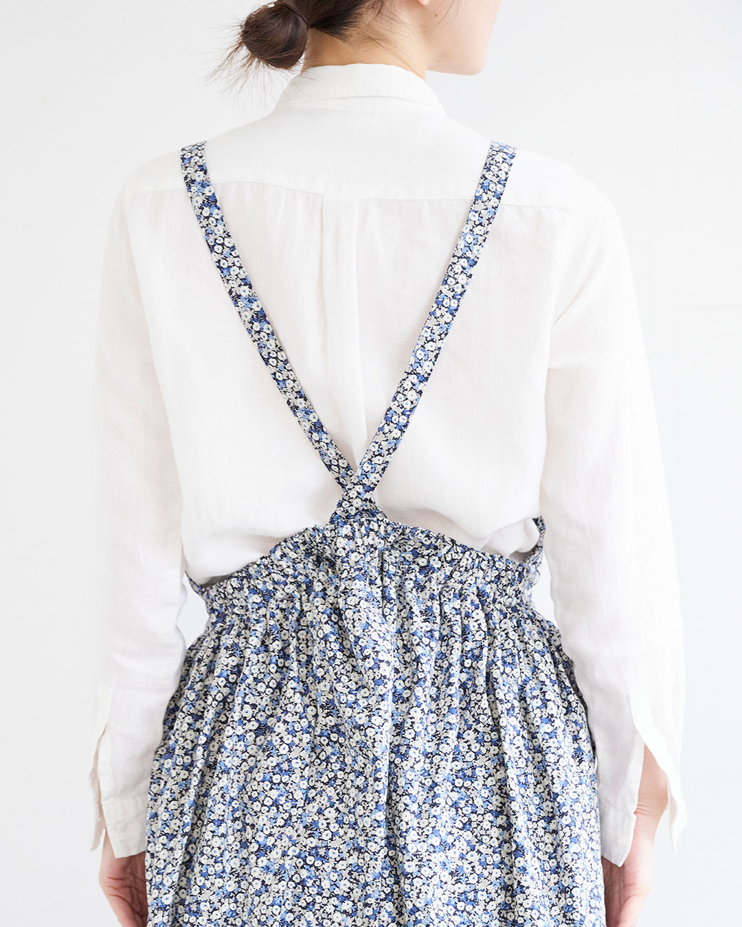 エプロンドレスのようなジャンパースカートです。寒い季節はパンツやロングスカートなどを合わせてレイヤードスタイルが楽しめます。ウエストはギャザー仕立てですが、ゴムは後ろだけに入れているので、すっきりとしたシルエットになります。使った布は30ビエラの微起毛のやさしい小花柄。起毛をかけてソフト加工しているので、とても柔らかく肌ざわりのよい生地です。