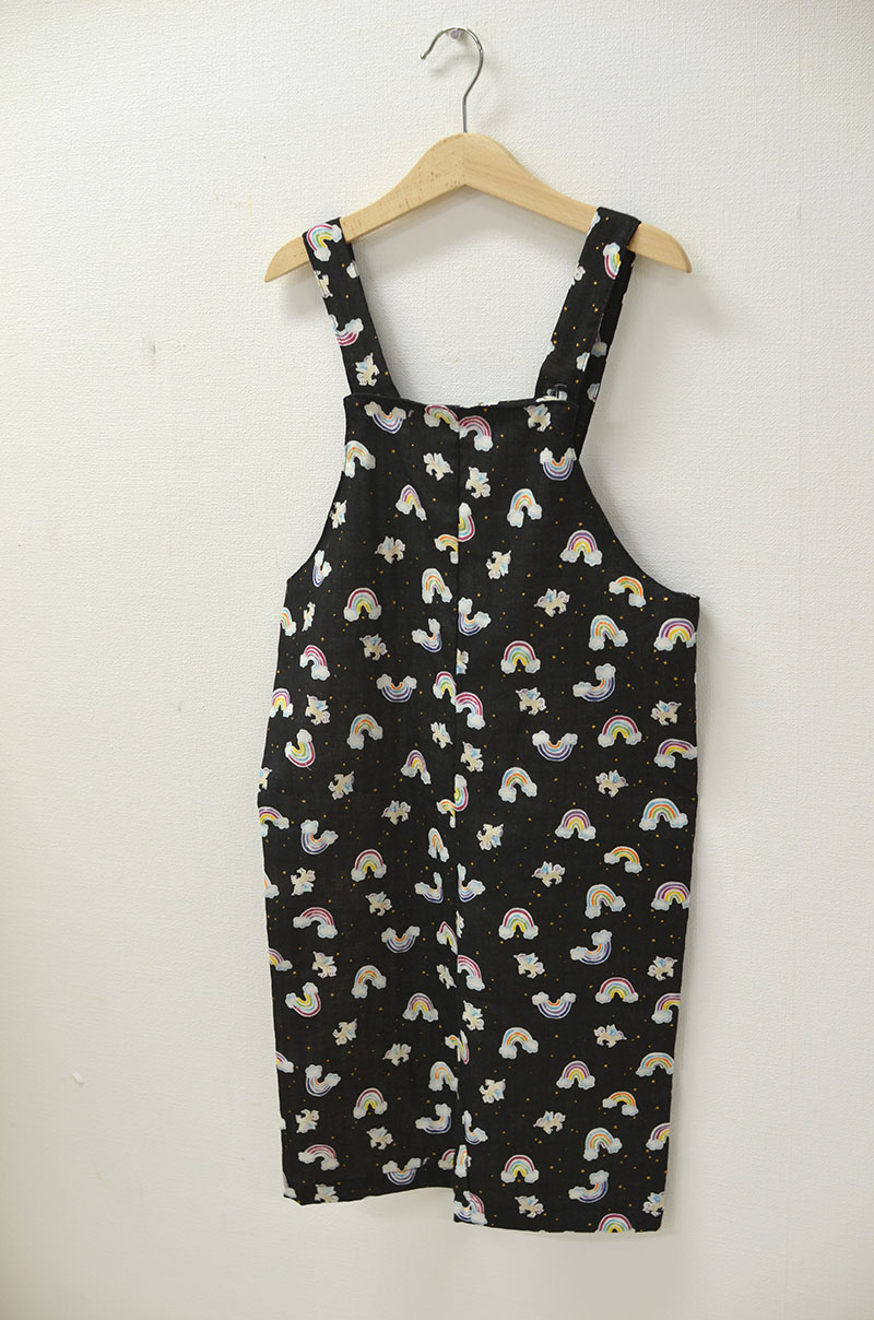 男の子も女の子も無理なく履けるデザインのキッズサロペットは、1枚あるととっても便利なアイテム。使った布は「Pastel world」シリーズのレインボー柄、コットン100%のダブルガーゼです。地色は写真の黒のほか、青やピンク、白もあります。