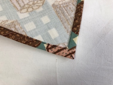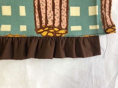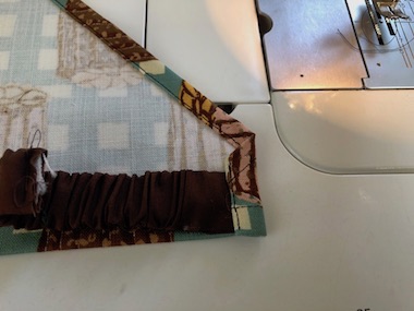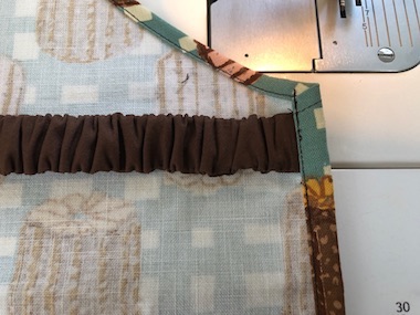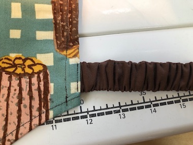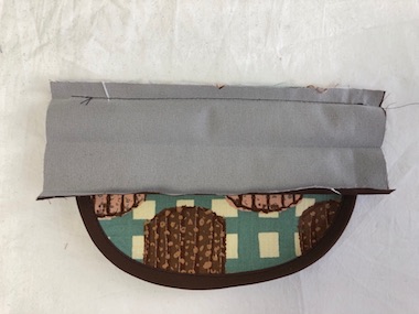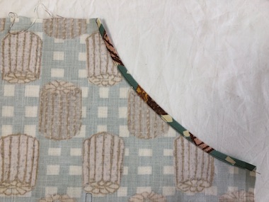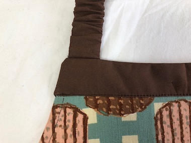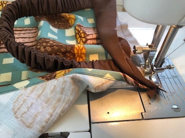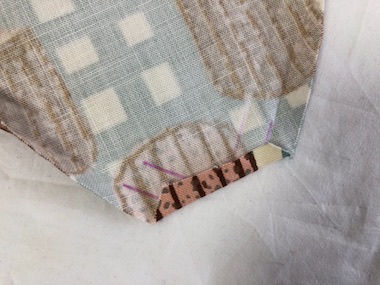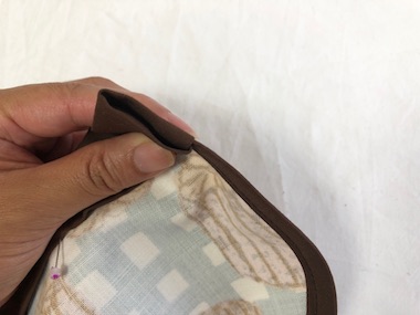 縁布に首ひも(ひもB)を挟んで縫う(首ひもがねじれないように注意!)本体と縁布を中表に合わせて縫う。
