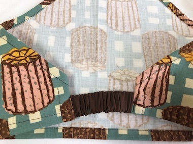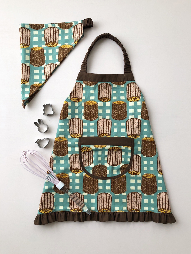 美味しそうなカヌレが布いっぱいに広がった布は、OYATSUシリーズ。エプロンひもやポケット、裾のフリルに茶色の無地を使うことで、より一層柄が引き立つデザインに。小さい子でも自分で着脱できるように、ゴムひもと面ファスナーを使っています。エプロンとお揃いで三角巾も作ってみて!