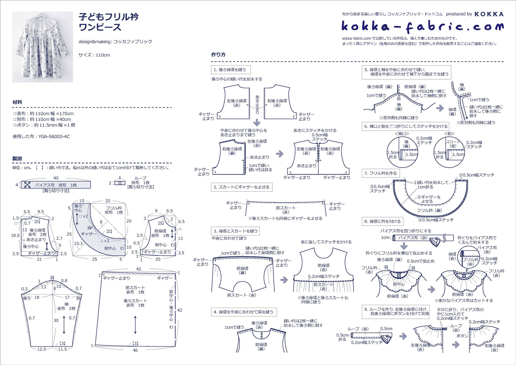 大きなフリルの襟が愛らしい子どもワンピースです。使った布は「Color of Character」シリーズ。水玉模様の総柄は、天地や柄合わせを気にせず縫えます。洋服が縫いやすいコットン100%のシーチングです。