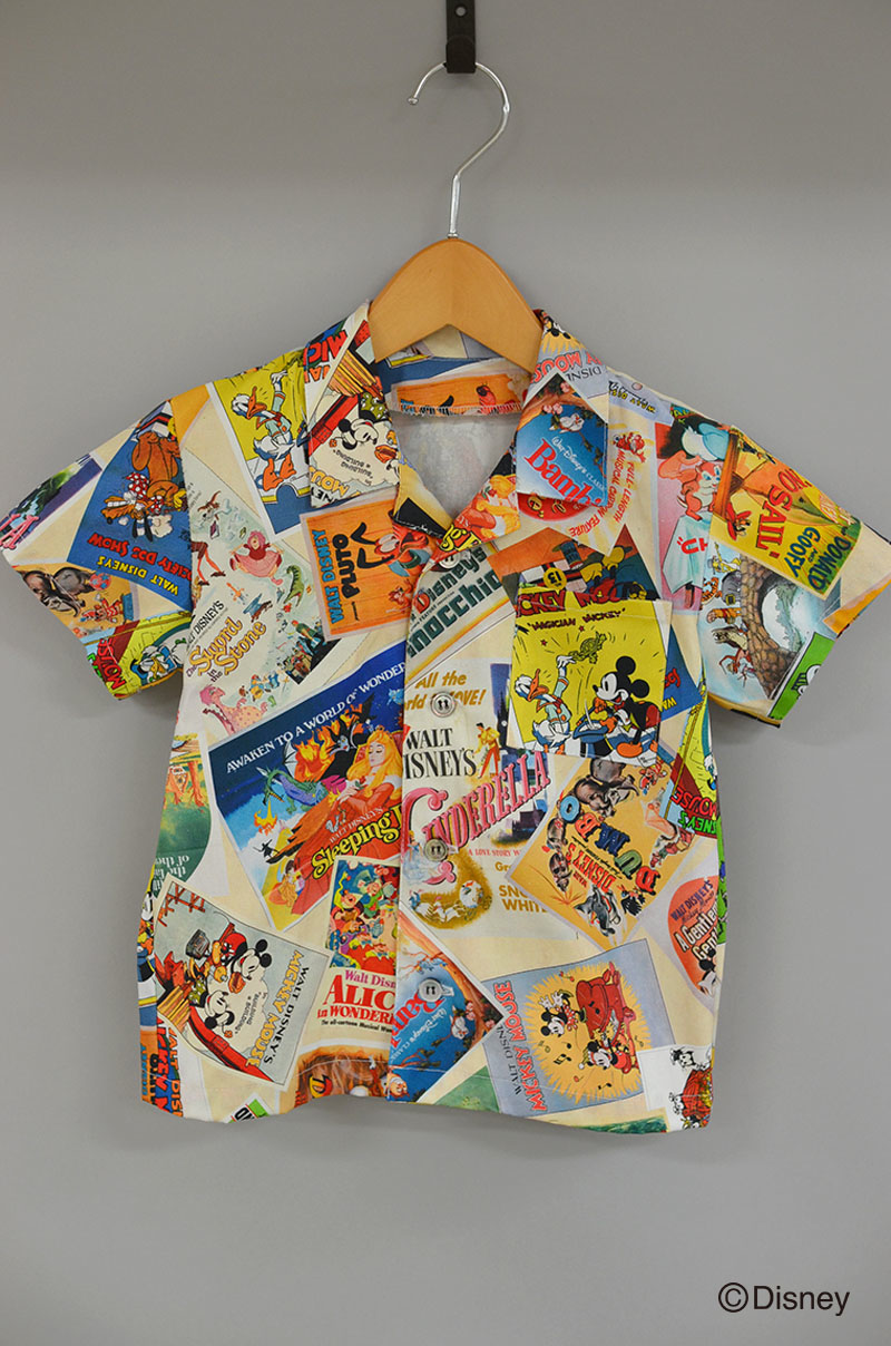 ディズニーのポスターアートが柄いっぱいに広がるプリントで作ったキッズ向け半袖シャツです。総柄なのでポスターの絵が途中で切れてもそれも味。柄合わせを気にせずに自由に使ってくださいね。ヴィンテージのアロハシャツのようなおしゃれな雰囲気になりますよ。