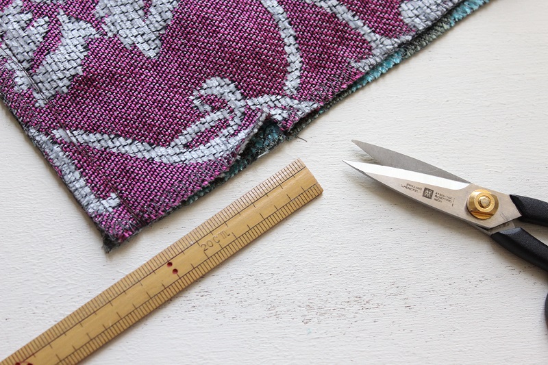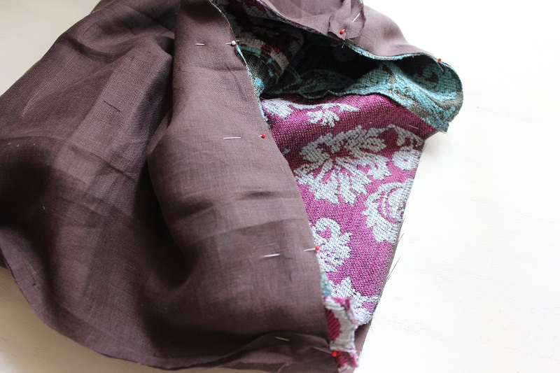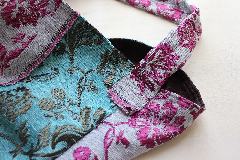 すごく上品な質感の生地で、どうやったら生地を生かした作品ができるかものすごく悩みました。リビングのクッションカバーやカーテンなど、ファブリック系に使用するとより生地の特性を生かせる気がしますが、今回はあえて、柄を大きく生かしたバッグに仕上げてみました。