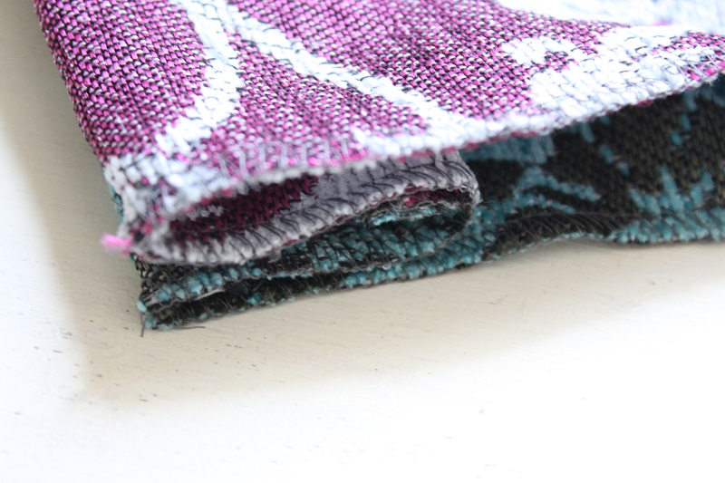 ジャガードニット、そして厚みのある生地だったので普段は片倒しにする縫い代の処理の方法を変えてみました。また、くたっとした質感を上品な生地と融合させるのにどんな作品にしたら一番映えるかものすごく悩みました。色の違う同じ柄を合わせることでシンプルでもインパクトのある作品に仕上げることができたかと思います。