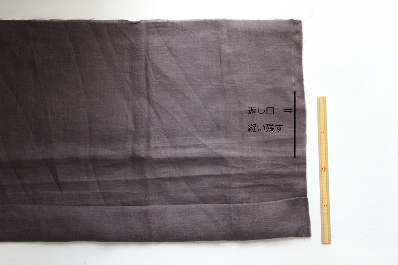 7で入れた合印のところに「わ」が来るようにたたみ、両サイドを縫う。この時片側に返し口を8cmほど縫い残す。