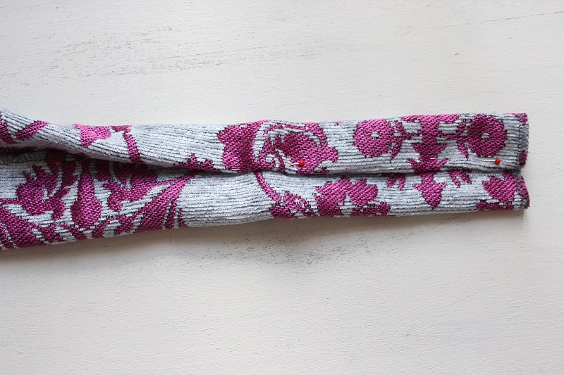 持ち手を縫う。写真のように折り、上からつつむようにしてまち針で留め真ん中を縫い合わせる。