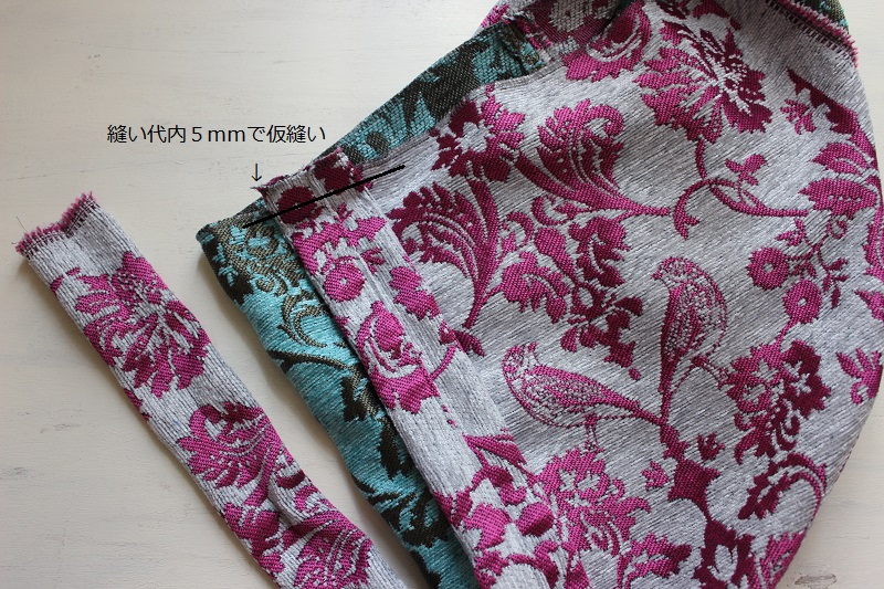 持ち手を表布の片側に表合わせにして留め縫い代内5mmで仮縫いする。