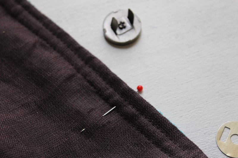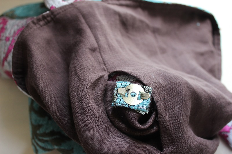 返し口から手を入れてマグネットボタンを取り付ける。この時当て布をするとよい。返し口を最後に閉じて完成。