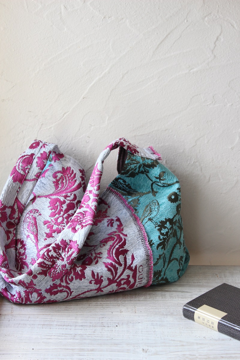 echinoのジャガード生地を使ったショルダーバッグが登場。作ってくれたのは、ハンドメイド作家で人気ブロガーの猪俣友紀さんです。クラシック調の「damask」柄のなかにもechinoらしい「鳥」が描かれたスペシャルな布を、あえて色違いで組み合わせ、個性豊かな作品に仕立ててくれました。
