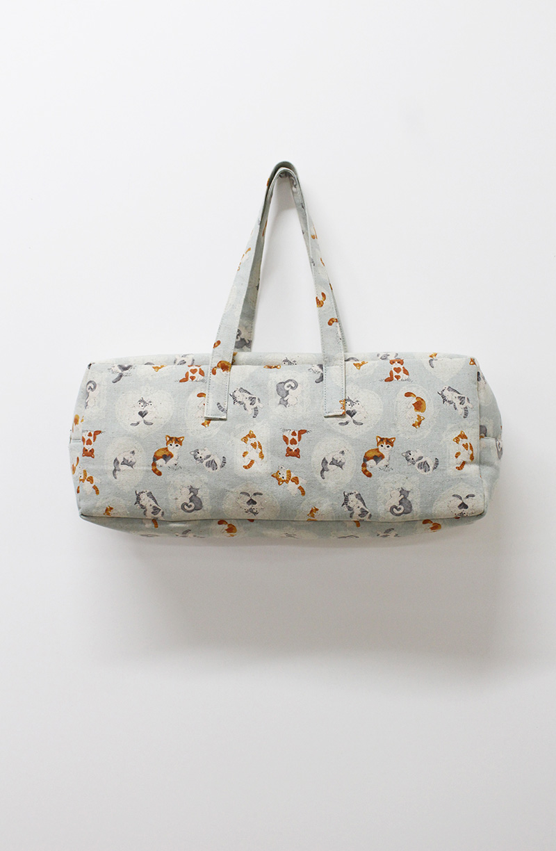 長財布や折りたたみ傘がすっぽり入る横長のトートバッグです。ファスナーつきなので、中身が見える心配がないのも安心。使った布は、「secret secret」シリーズの猫柄です。いろんなポーズの猫ちゃんに癒されます。バッグづくりにぴったりの綿麻キャンバスです。