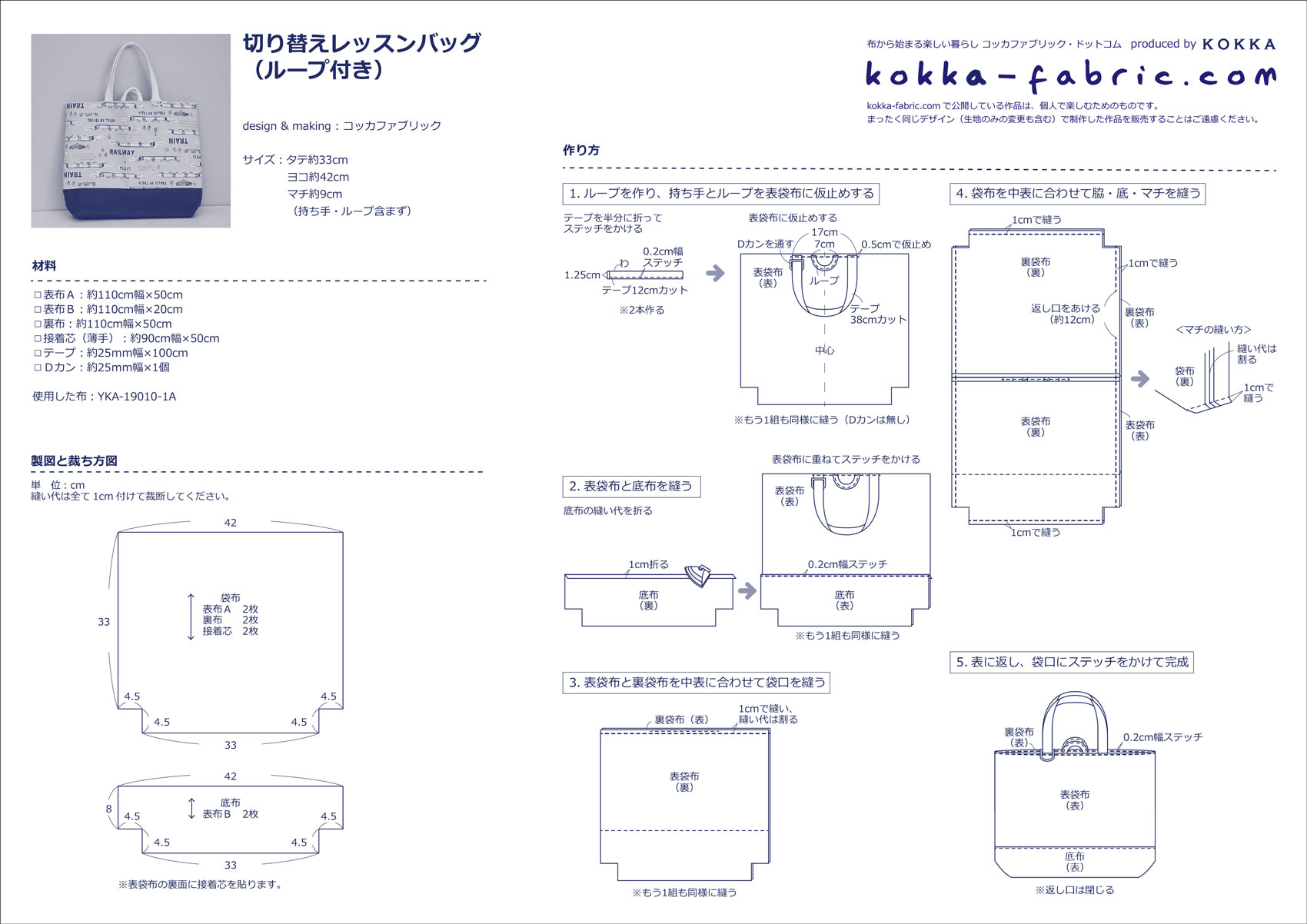 入園・入学グッズのマストアイテムといえば、レッスンバッグ。こちらのバッグは柄布と無地の切り替えデザインです。使った布は「School Boys」シリーズのトレイン柄。ランダムに柄が入っているので、柄の天地を気にせずに布取りできます。コットン100%のオックスフォードなので、ソーイングビギナーさんも安心して縫えます。