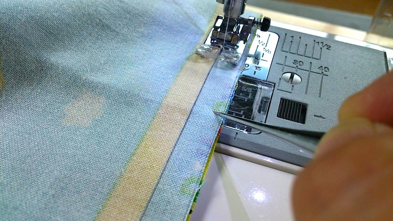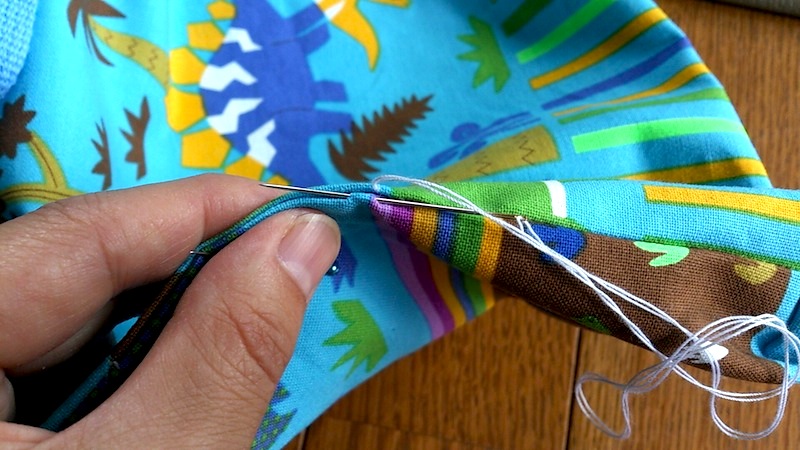 返し口から表に返し、返し口をコの字で閉じる。袋口にアイロンをかけ、周りをぐるりと縫う。