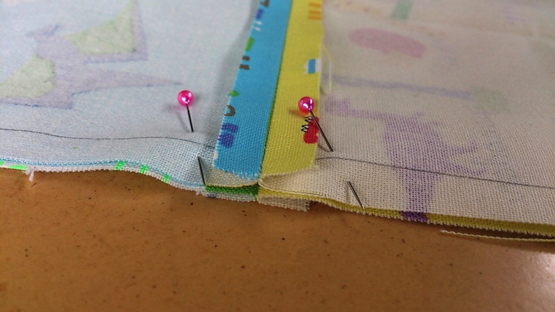 2を中表に合わせ、返し口を残して周りをぐるりと縫い、縫い代をアイロンで割る。このとき、袋口の部分をきちんとあわせておく。