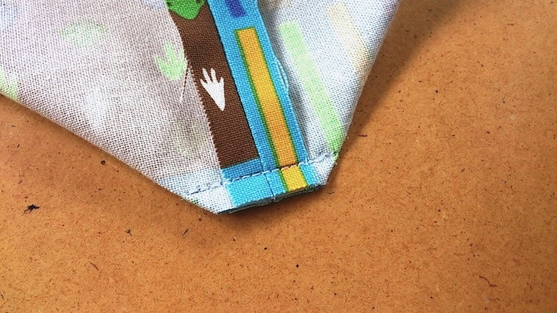 表袋・内袋のマチをそれぞれ3㎝に縫い、縫い代を1㎝ほど残して角を切り落とす。
