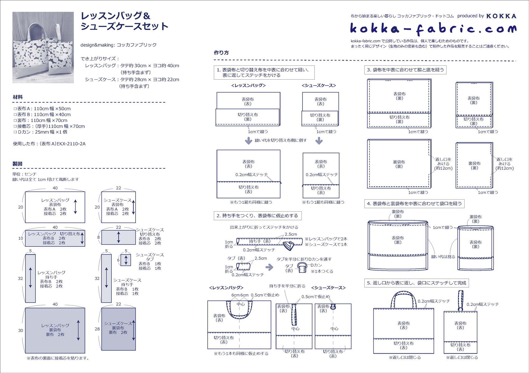 切り替え&裏地つきで簡単!レッスンバッグ&シューズケースセットの作り方