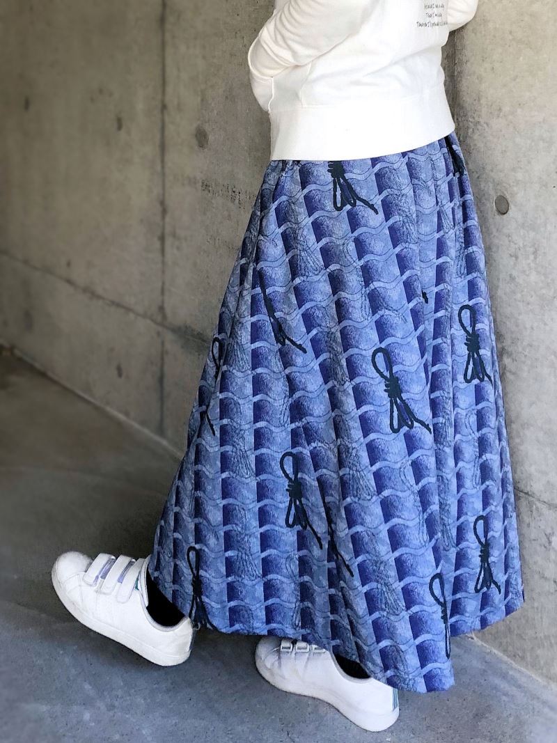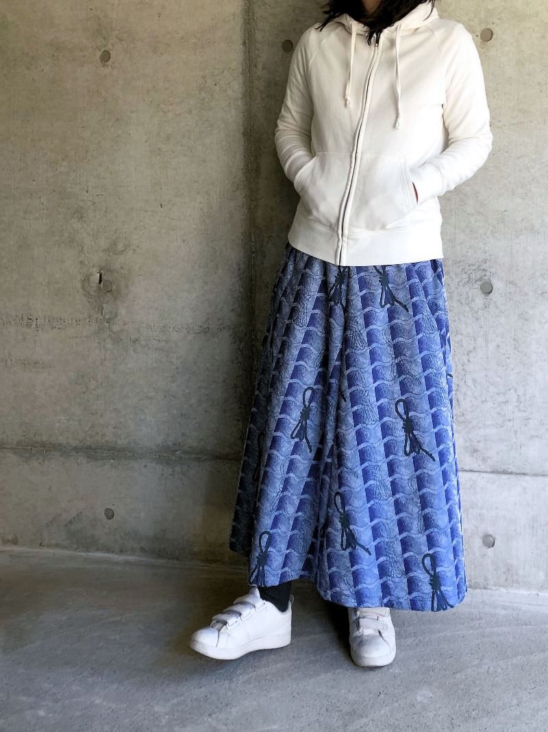ウキウキ気分でお出かけしたくなる、軽やかなフレアスカートです。使った布は「SCENES」シリーズ。日本の産地である西脇で織られたジャカードに京都でプリントを施しました。コットン100%の柔らかな肌触りがうれしくなります。パーカにスニーカーのシンプル&カジュアルなコーデに合わせると、布の美しさがいっそう引き立ちます。