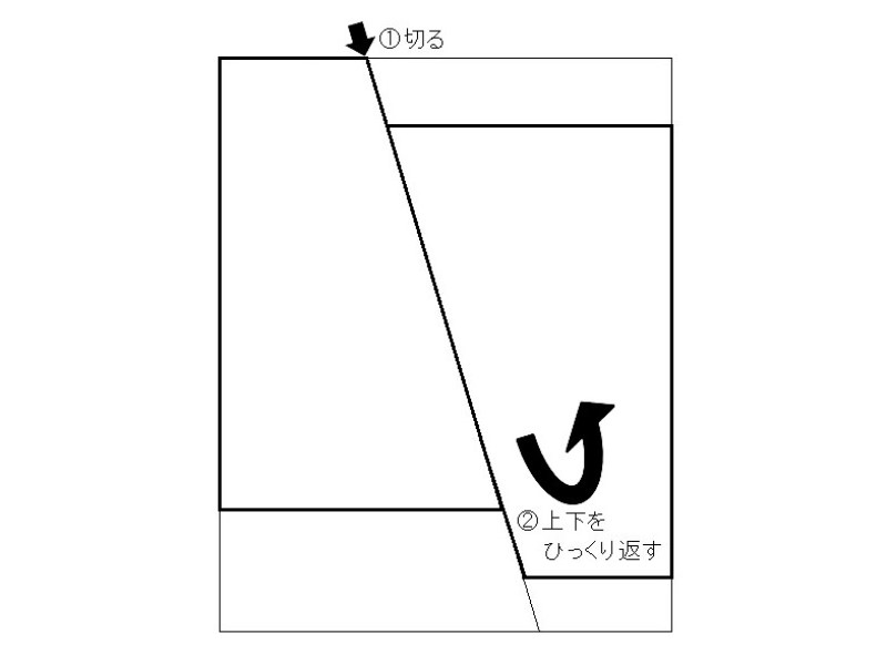 大きな型紙を作るのは大変です、効率のいい作り方を…100円ショップでも売っている模造紙1枚あれば入ります。図のように、まずは台形を書き、脇線で紙をカット、脇線の上下を合わせたら固定をし、その後、ウエストと裾のカーブ、切替線を書き入れます。