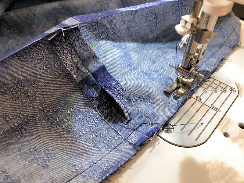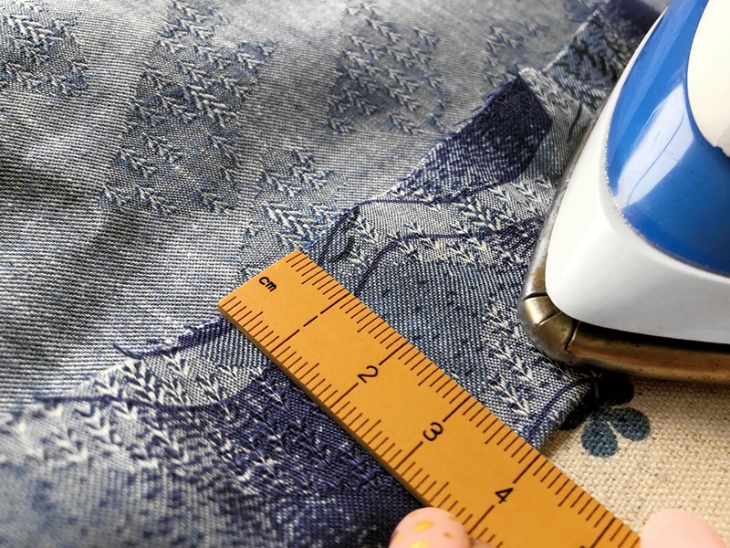 裾を上げている所です。ここの縫代は4cm、まずは4cm折ります。この時、画像のようにアイロンの先を使い、折り目付近にのみアイロンを乗せます。裾にいくにつれて長いので、このようにひだが出ますが、アイロンで潰さずに折り目だけをつけてミシンをかけると、自然な縫いあがりになります。
