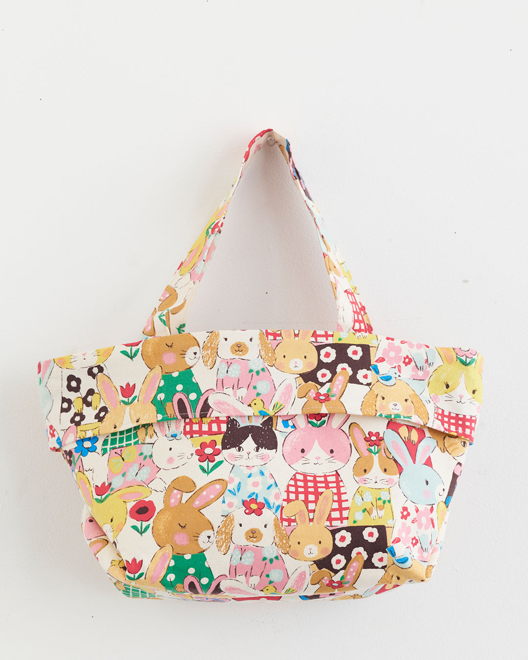 表布に接着キルト芯を貼ったしっかり仕立てのランチトートバッグです。共布でつけた見返しがデザインのアクセントになっています。使った布は「Powerful animal」シリーズ。いろんなうさぎや猫ちゃんがいっぱいのにぎやかな生地です。コットン100%のオックスフォードなので縫いやすく、バッグづくりにおすすめです。