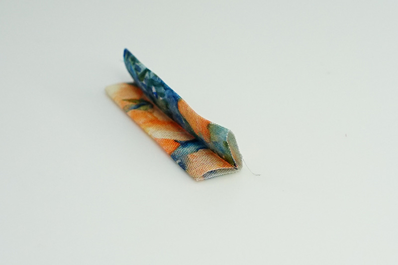 中心に向かって両端を折り、さらに中心で折ります。両端にミシンをかけます。
