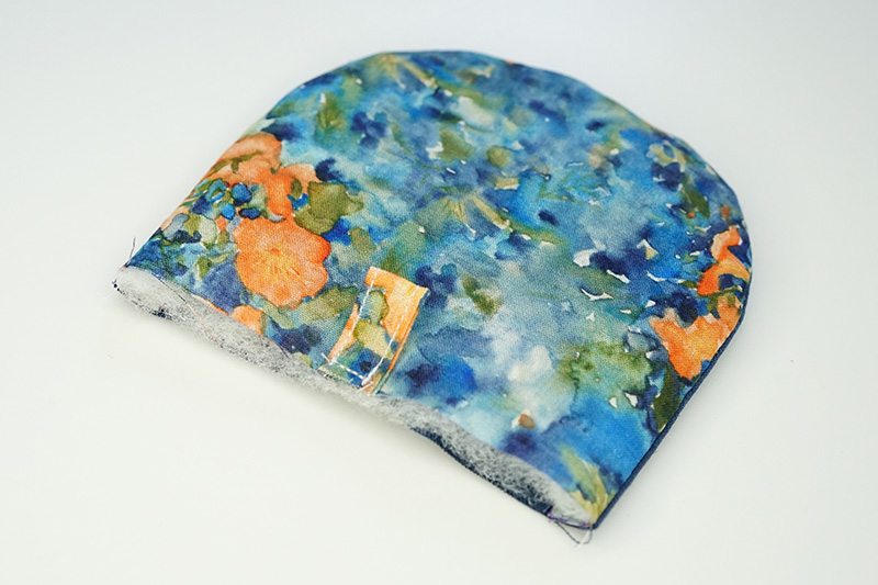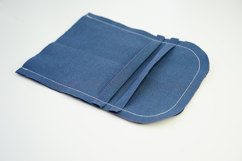 フラップを作ります。表布にキルト芯を重ねます。裏布を中表に合わせ、本体つけ側の辺を残して縫います。縫い代のカーブに切り込みを入れます。