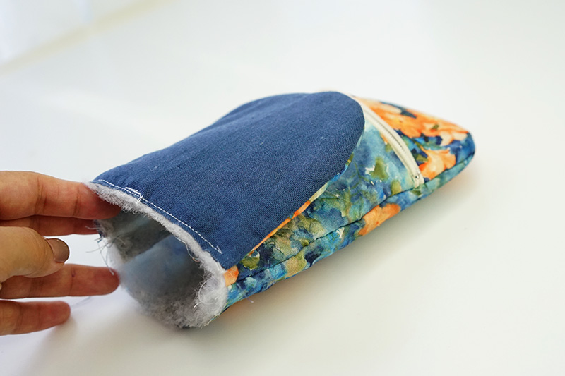 表布(前面)にもキルト芯を重ねます。④の後ろ面を中表に合わせ、入れ口側を残して縫います。縫い代のカーブに切り込みを入れます。