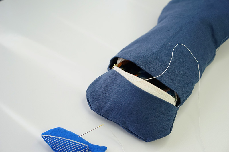 裏袋のファスナー付け位置を合わせ、まつりつけます。