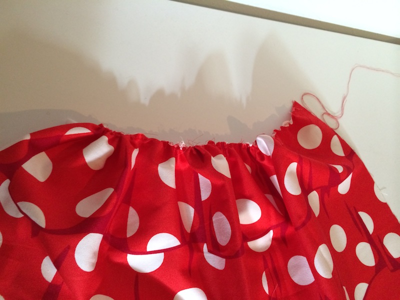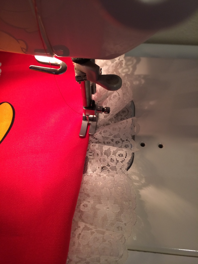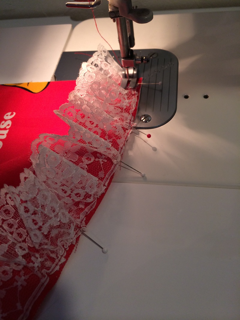 ミニーちゃんの柄でしたので、やっぱり少しでもミニーちゃんのドレスに近づけるようレースをふんだんに使ってみました。