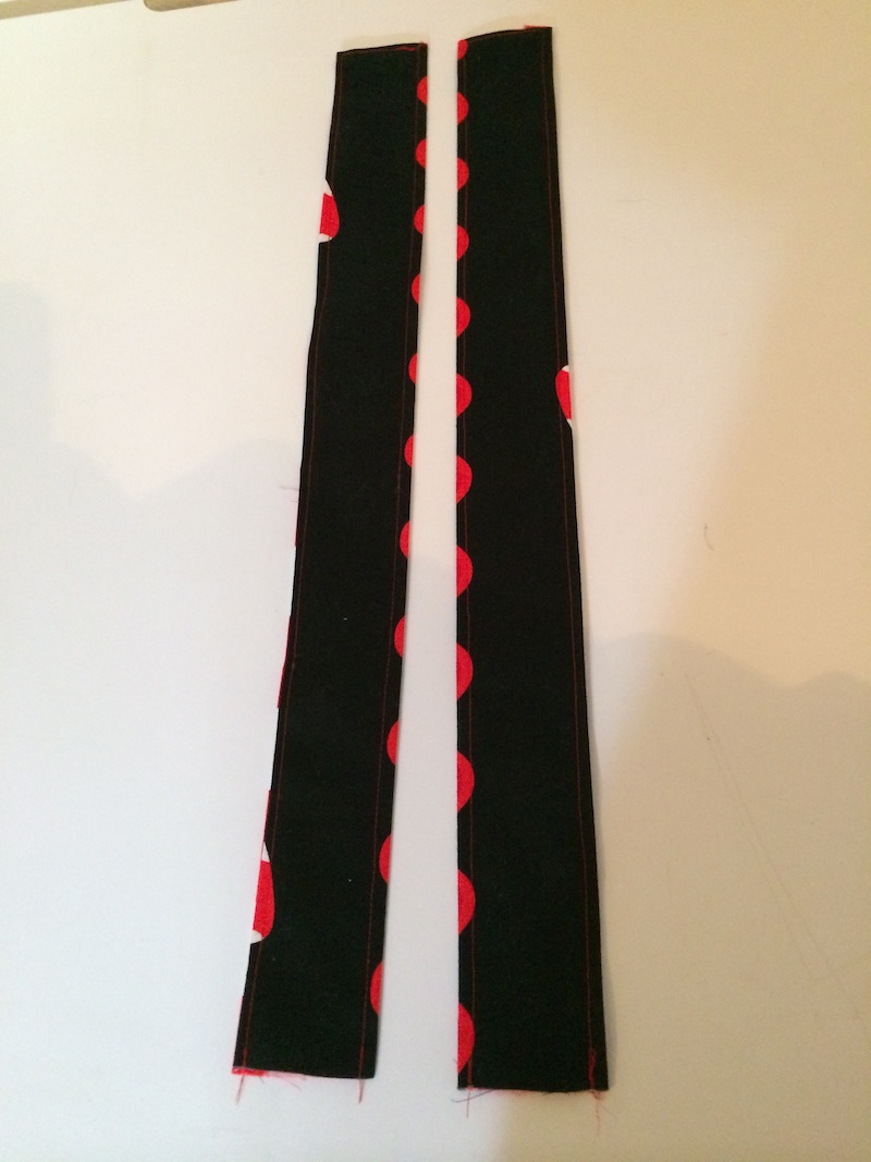 胸当てリボン布の長辺の両端を1cm内側に折り、さらに二つ折りにして両端を5mmで縫う。
