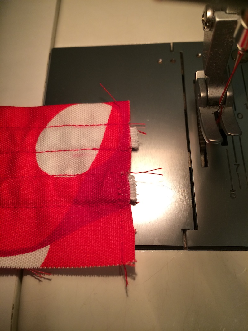 「わ」側から2番目と4番目にゴムを通し、両端をしっかりと縫いつける。
