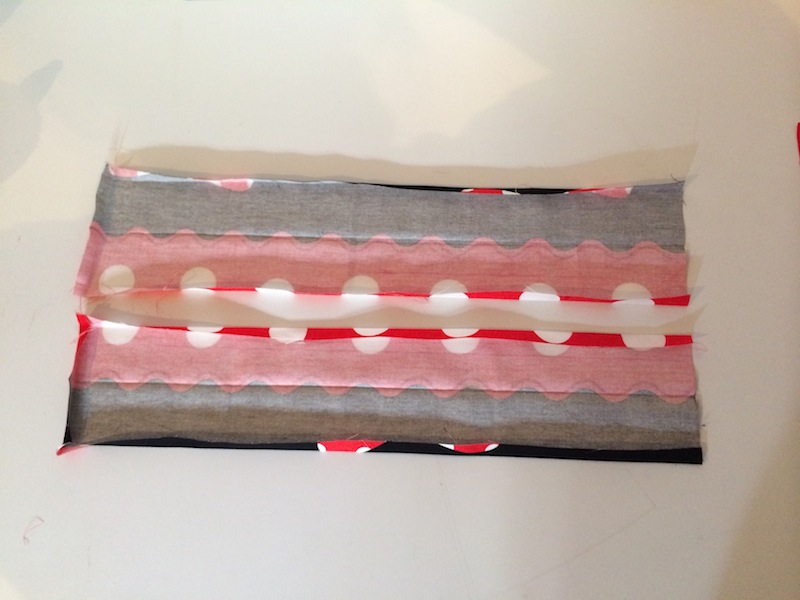 胸当て布を中表に合わせ、ウエスト布を挟んで、両端を1cmで縫う。