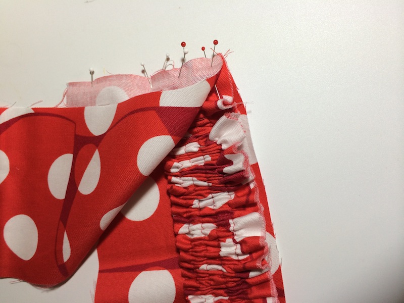 ウエスト布とスカート布を合体させる際は、ウエスト(うしろ)部分のゴムを伸ばすようにひっぱりながら縫ってみてください。