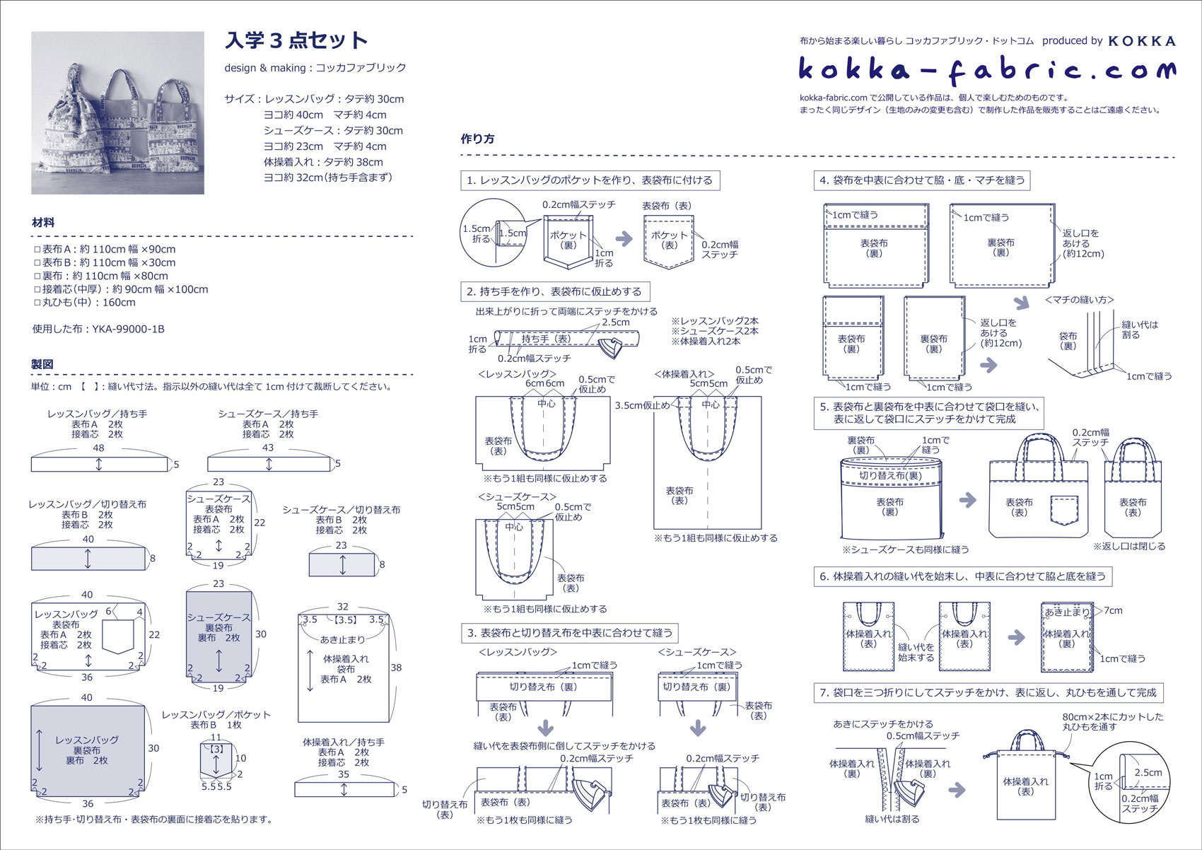 レッスンバッグ、シューズケース、体操着入れの入学3点セットです。レッスンバッグは外ポケットつき。体操着入れは持ち手のついた巾着バッグになっているので、持ち歩きもラクチンです。使った布は「funny cats」シリーズ。たくさんの猫ちゃんが登場する楽しい柄です。コットン100%のシーチングなので縫いやすく、ソーイングビギナーさんにもおすすめです。