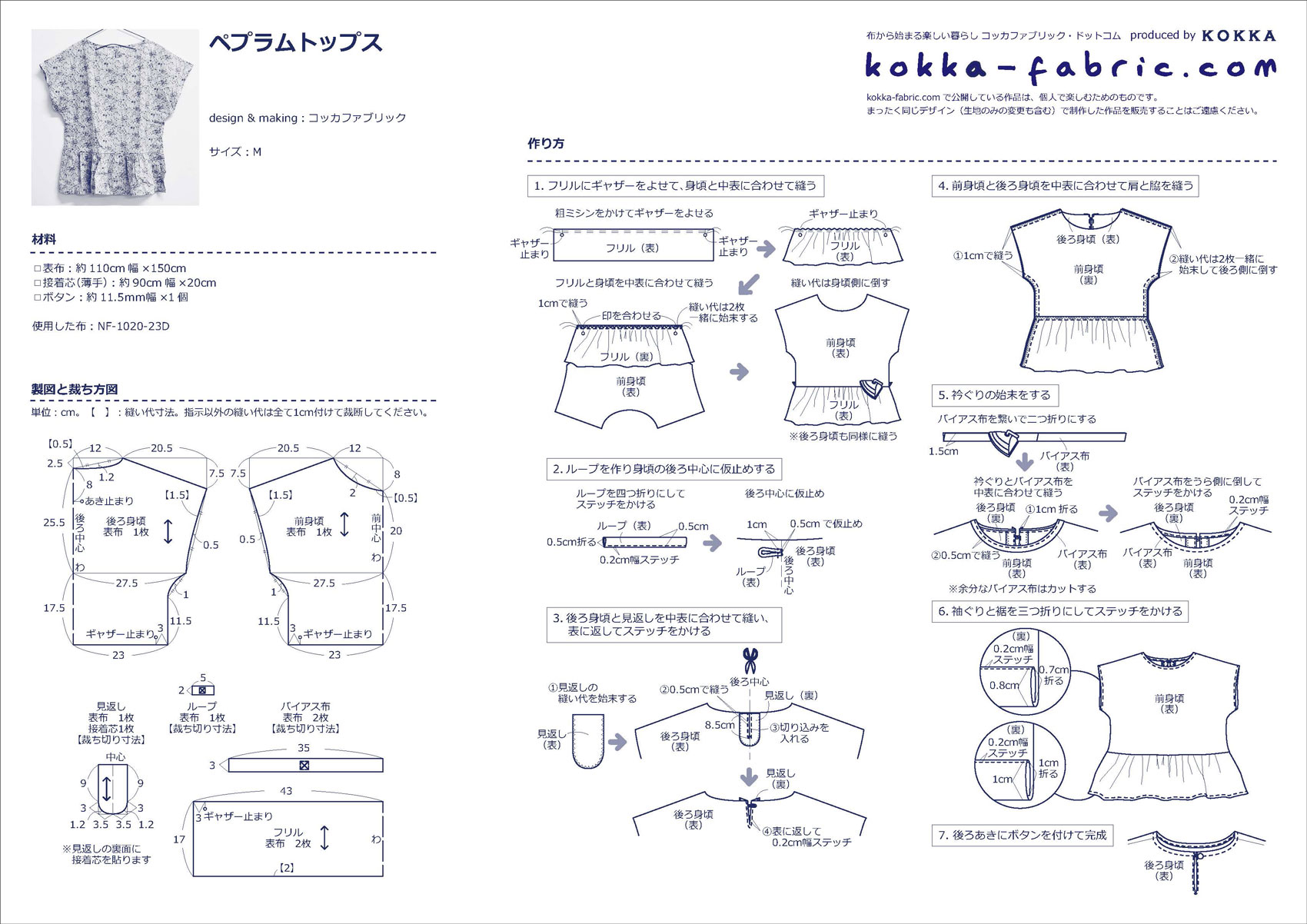 裾部分のフリルがふわっと広がったペプラムトップスは、大人の夏コーデにぴったり。メリハリ感をキープしたフェミニンなフォルムは、デニムやフレアパンツ、ティアードスカートなど、どんなボトムスにもマッチします。使った布は「Flownny」シリーズの綿ローン。お洋服づくりにおすすめのやさしい花柄です。