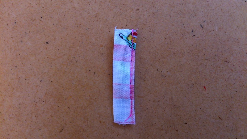 長い方の両端を5㎜ずつ折り、さらに半分に折り幅1㎝長さ4㎝のタブにし、端ミシンをかける。これを2本作る。