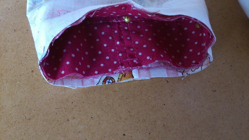 側面と底に合印をつけておき、わにした側面と底を合印に合わせてまち針で止める。さらに円のカーブに合わせて側面にいくつか切り込みを入れてまち針で止め、目打ちで押さえながらゆっくりと縫う。縫った後縫い代を5㎜に切り落とす。