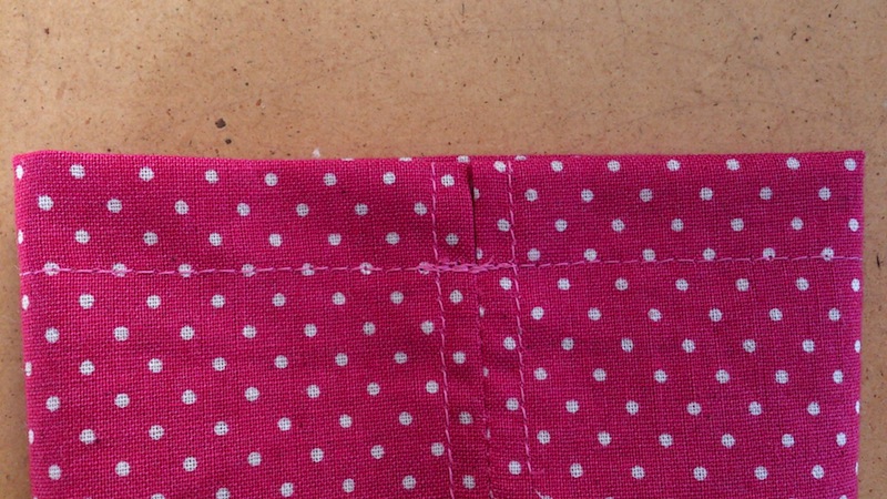 カットした生地をわにし、ひも通し部分をあけて縫い、縫い代を割って押さえミシンをかける。外表に半分に折り、わから1.5㎝のところをぐるりと縫う。ひも通し口のところで返し縫いをするようにするとよい。