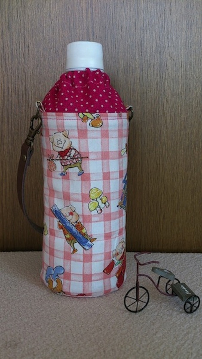 おとぎ話シリーズ、nunokara MIMI and NENE、3匹のコブタ柄で作ったペットボトルホルダーです。入園入学グッズとしてはもちろん、保温保冷アルミシートつきなので、オールシーズン使えます。制作してくれたのは、ダイナソーランドの生地でレッスンバッグを作ってくれた佐藤晴代さんです。
