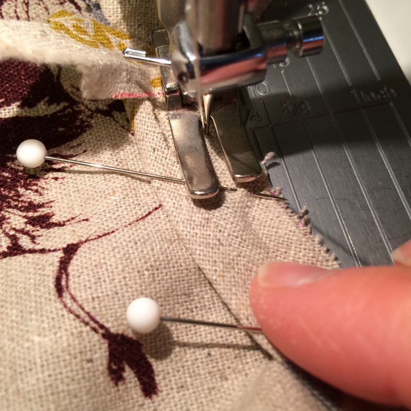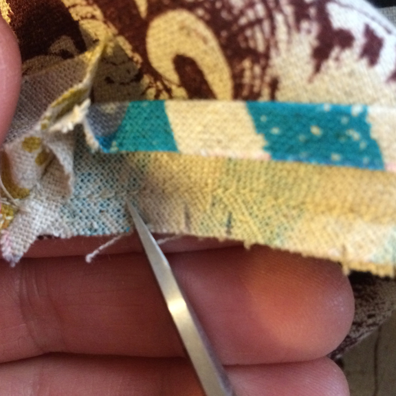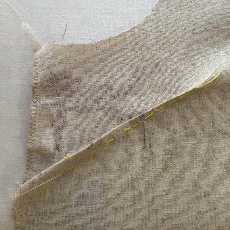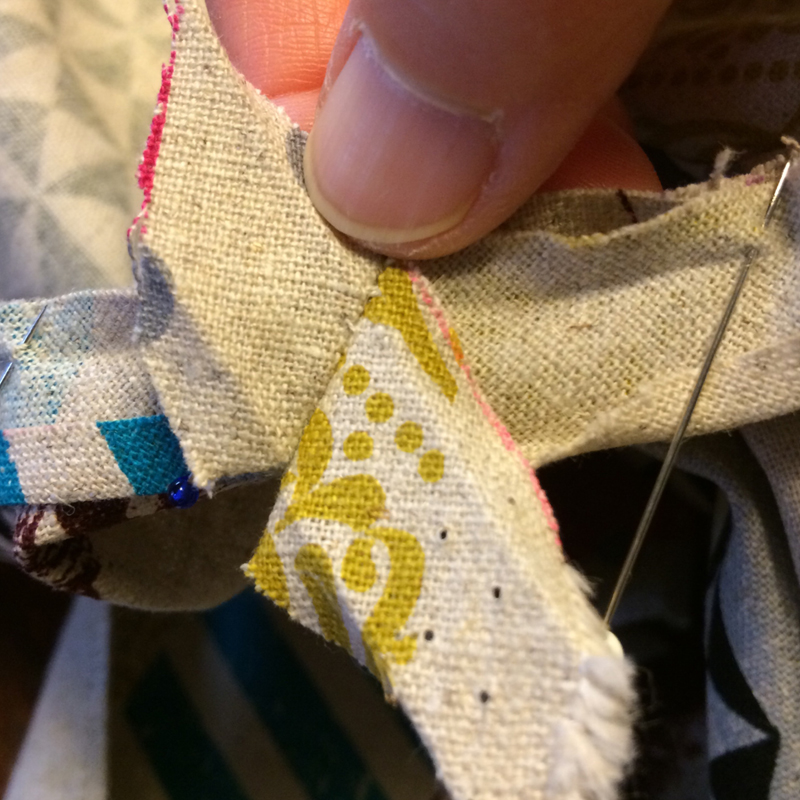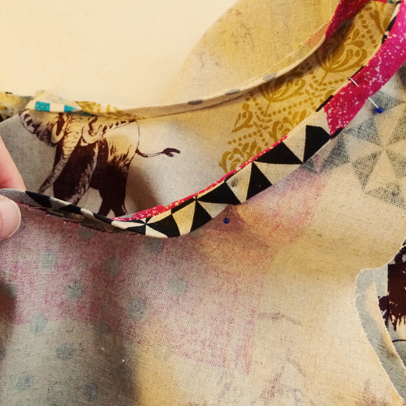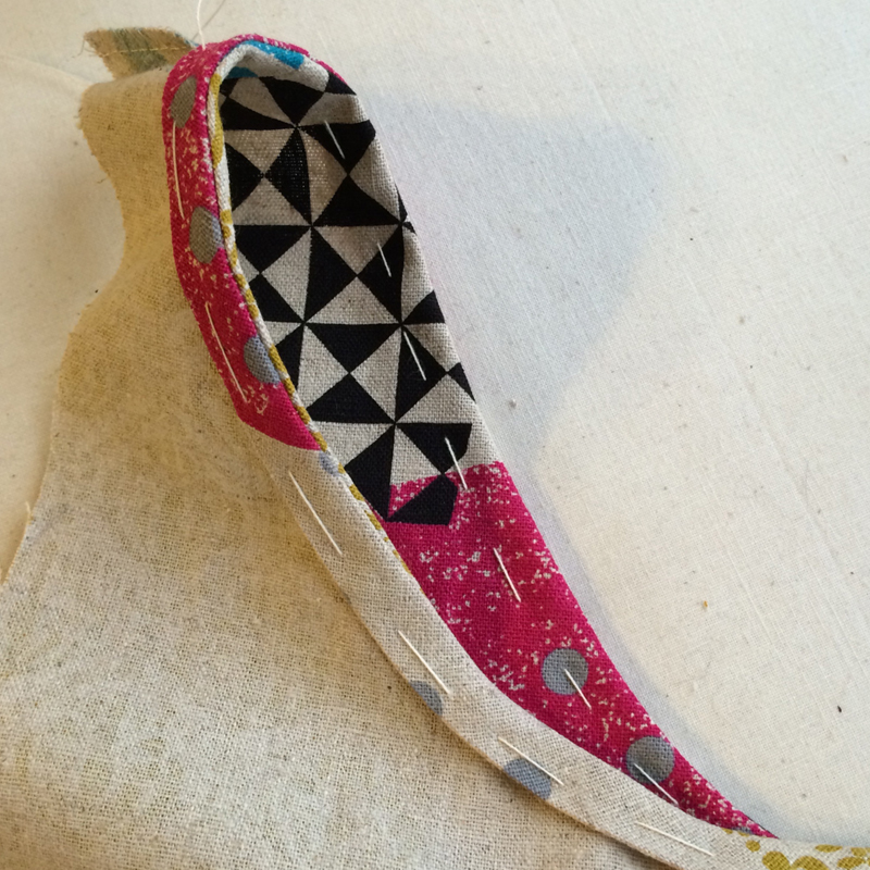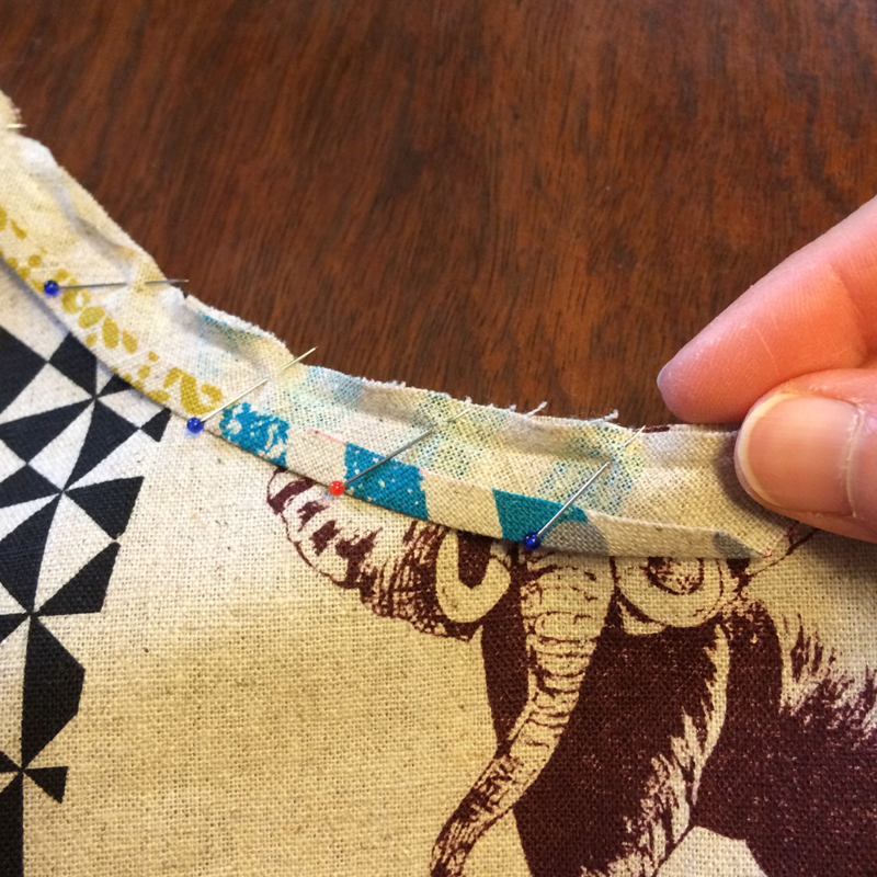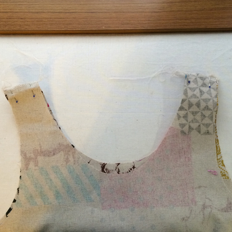 身頃を裏返して、バイアス部分を裏へ折り曲げ、しつけをし、アイロンで整えてミシンをかける。