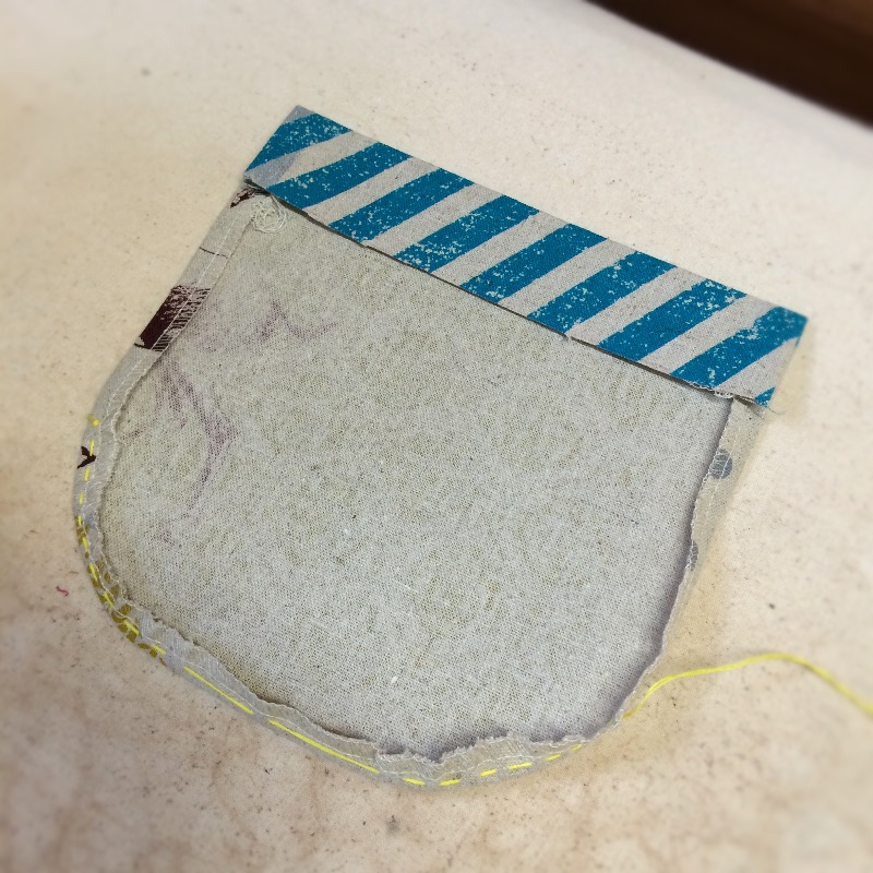 ポケットの丸みの部分は、縫い代の真ん中くらいをしつけ糸でぐし縫いする。ポケットの位置に型紙を置き、しつけ糸をひっぱって縮め、型どおりになったところでアイロンをかける。上から3㎝のところを折り、ミシンをかける。