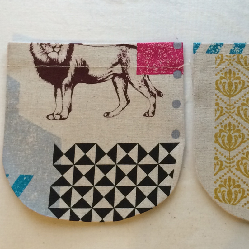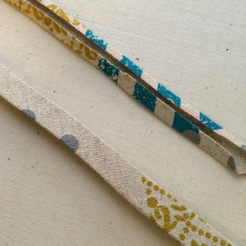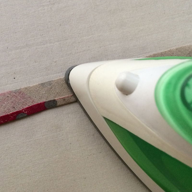 バイアステープを作る。両端から5mmずつ折り、アイロンをかけておく。3本作る。