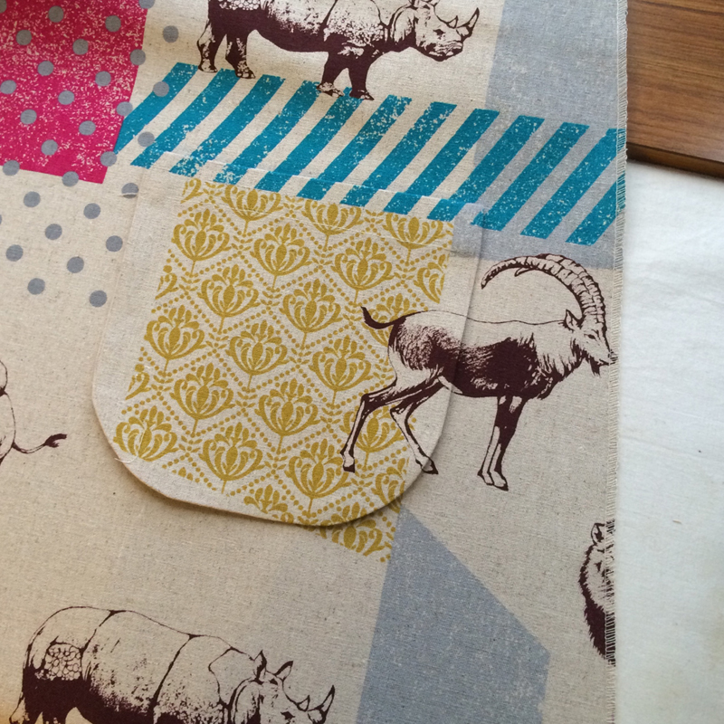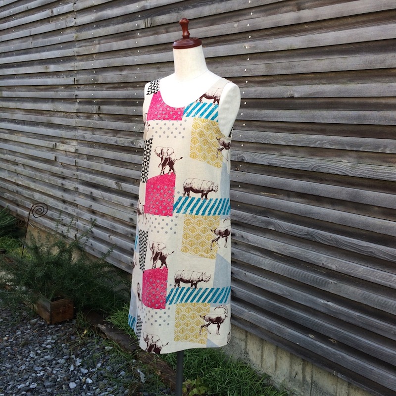 echinoのzonで作ったシンプルなワンピースです。ゾウ、サイ、シカ……。布の裁ち方で見える動物が変わるので、柄取りをあれこれ考えるのも楽しそう。両脇につけた大きなポケットは、お料理にガーデニングに、使い勝手バツグン♩ 作ってくれたのは、さわかおりこさんです。