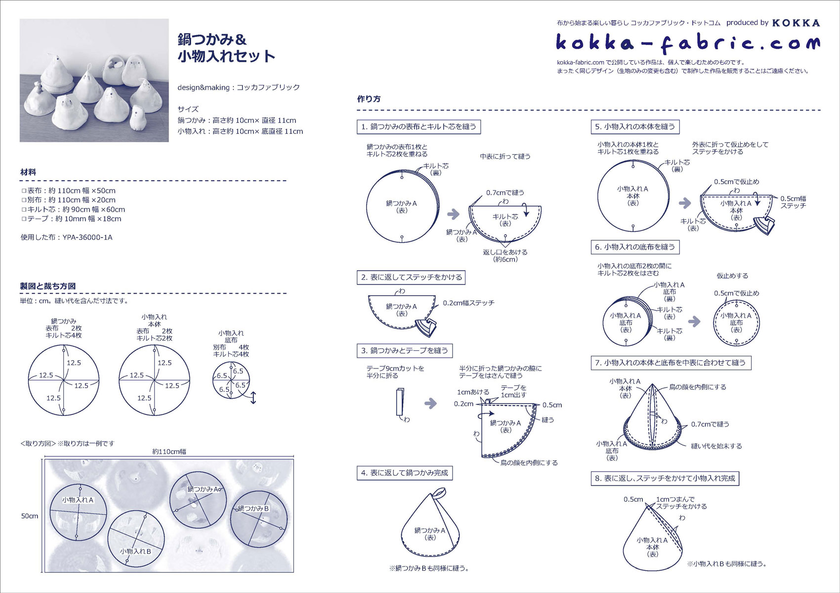 三角のフォルムがキュートな鍋つかみと小物入れです。同じ用尺で、鍋つかみと小物入れの2アイテムが作れるお得なレシピ♪ 使った布は「WHAT do you make?」シリーズの小鳥柄。小鳥の顔がちょうど真ん中にくるように布どりすれば、小鳥のような愛らしい鍋つかみと小物入れができ上がります。