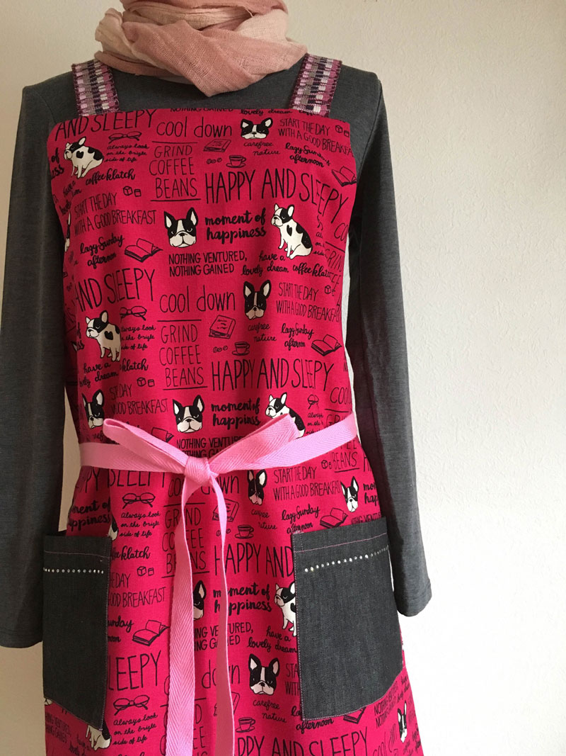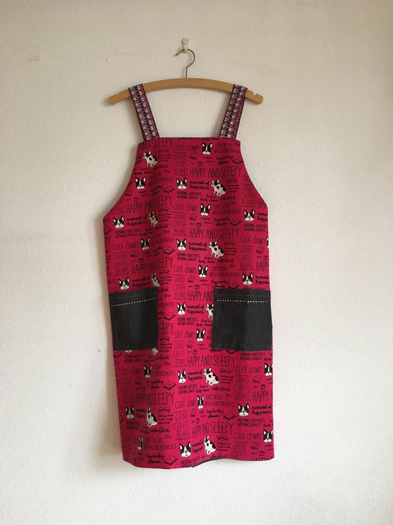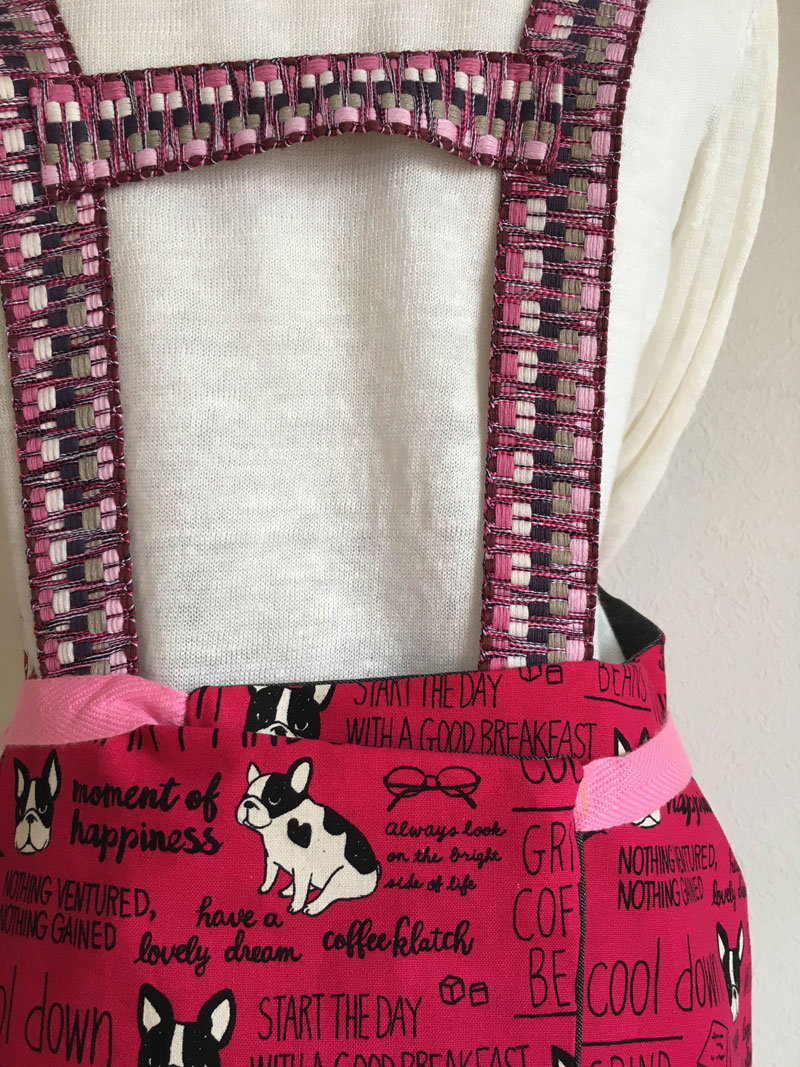 とてもしっかりした生地でした。フレンチブルドッグの間隔が広いので小物を作るよりも大きなもののほうが、フレンチブルドッグがたくさんみえて、フレンチブルドッグ好きな方にはアピールできると思いました。そのため大きなものがいいと思い、エプロンを思いつきました。また生地もしっかりしているので、長く使用できるのではないかと思いました。