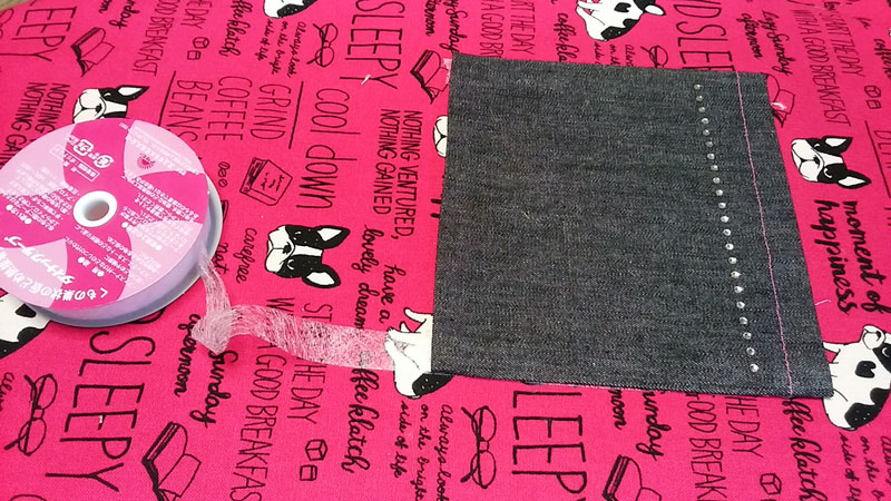 次は、パーツの取り付けです。リバーシブルなので、生地は中表にします。片方の生地の上にパーツを置き、仮止めします。ここはずれないようにしつけ糸で留めました。