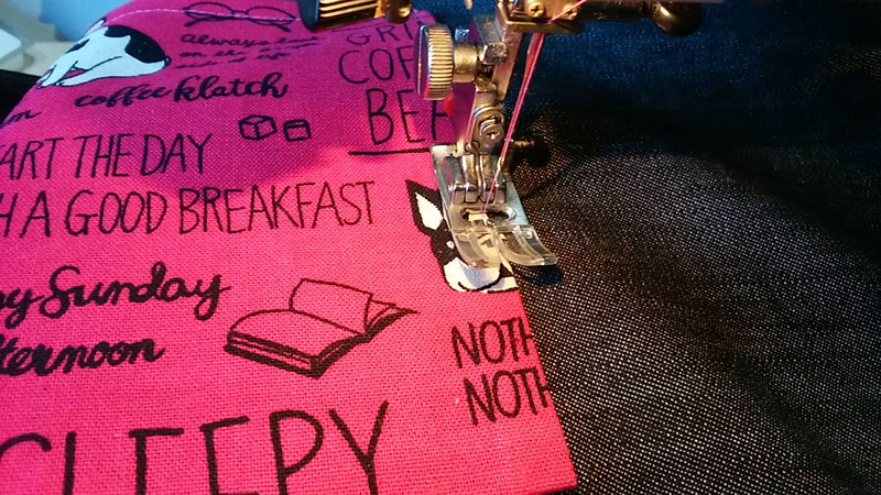周りをアイロンのりテープで仮押さえして、裾の20cmほどを返し口にして、後は全てミシンで縫い付けます。